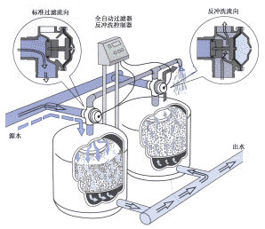 標(biāo)準(zhǔn)設(shè)備的設(shè)計(jì)主要采用了以色列進(jìn)口的過濾器專用三通閥,該閥專為介質(zhì)過濾器應(yīng)用而設(shè)計(jì),工作時(shí)原水經(jīng)三通閥直接進(jìn)入除氧器罐體內(nèi),出水自罐下部進(jìn)入總出水管。水中溶解氧與海綿鐵發(fā)生化學(xué)反應(yīng)產(chǎn)生不易溶于水的絮狀沉淀被海綿鐵顆粒攔截下來,沉淀積聚在罐體內(nèi)造成水流阻力增大,進(jìn)出口壓差增大,當(dāng)壓差增加到一定值時(shí)(0.05~ 0.07MPa),壓差表向控制器發(fā)出反沖洗信號,A罐電磁閥加電,A罐頂部的三通閥動(dòng)作(自標(biāo)準(zhǔn)過濾狀態(tài)轉(zhuǎn)為反沖洗狀態(tài)),A罐進(jìn)水口關(guān)閉,反沖洗口打開;由于B罐此時(shí)處于工作狀態(tài),反沖洗水經(jīng)出水口進(jìn)入A罐底部,經(jīng)罐頂沖洗閥流向排水口,完成反洗動(dòng)作,控制器控制反洗時(shí)間以達(dá)到所要求的沖洗效果,一般為3~15分鐘。